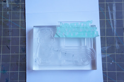 The image that you want to have it on the front, has to be the one that you stamp first. And I wanted a second stamp behind it but the image was a bit larger so I had to extend the height of the shelter. To do this, I masked off the top part (the shelter) and a bit of the two bars and stamp the rest of the image as usual. Remember to take off the tape before stamping!