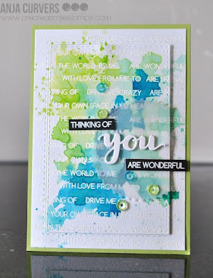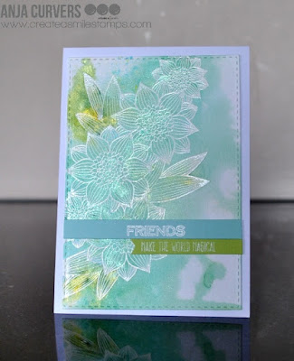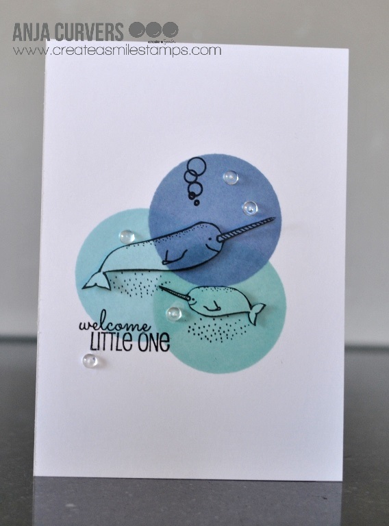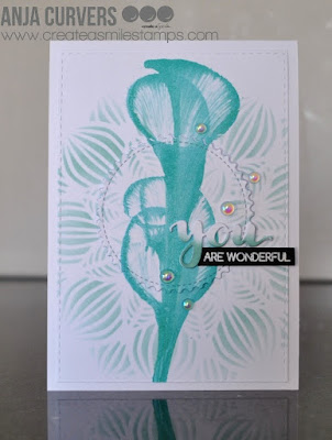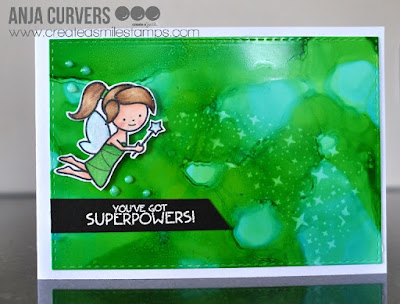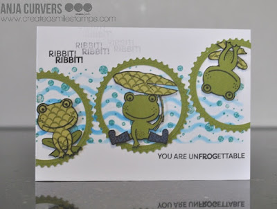 I used a horizontal cardbase and used a stencil for the background and a dotted clingstamp. Diecut some circles out of green paper and stamped the images onto different patterned papers and assembled the images. Placed it all onto the cardbase and stamped te sentiment.